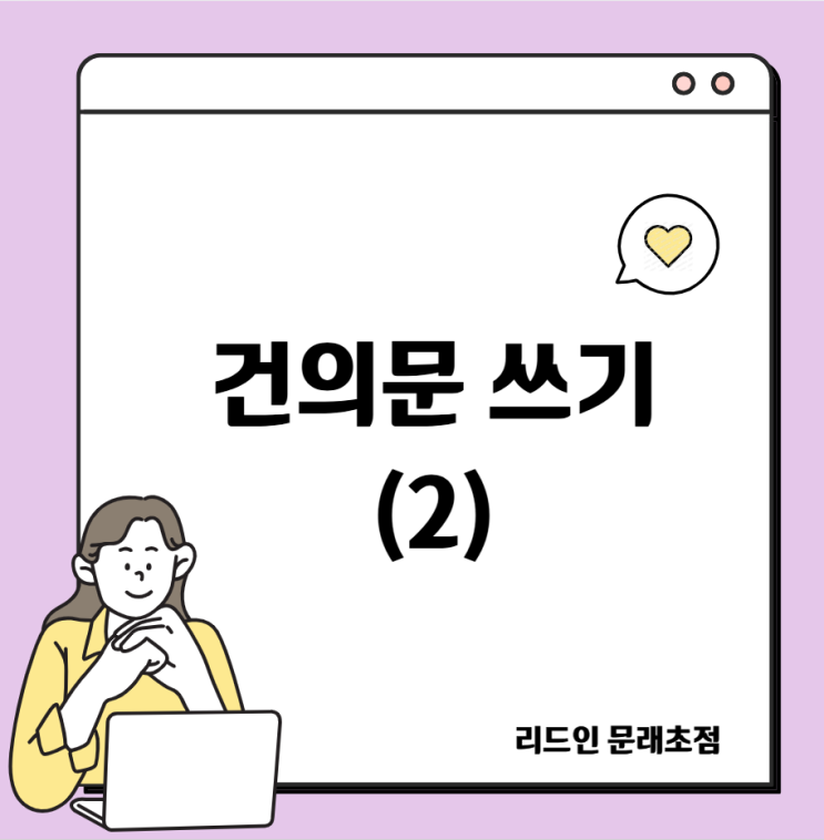 안녕하세요! 리드인 문래초점입니다. :) 오늘은 지난 시간에 이어서 건의문의 전체 구성과 실전 예시 등을 살펴보려고 합니다. 준비 편에서 탄탄한 기초를 마련해두었으니, 차근차근 따라 한다면 어렵지 않게 건의문을 완성할 수 있을 거예요! 1. 건의문의 기본 구조 건의문은 비교적 정해진 형식이 있는 글입니다. 따라서 아래의 구조를 지키는 것만으로도 글의 완성도가 크게 올라갑니다. [건의문의 기본 구성] 1) 머리말 – 건의 목적과 문제 제시 2) 본문 – 문제 상황 + 근거 + 해결책 3) 맺음말 – 기대 효과 + 정중한 마무리 2. 실전 예시로 보는 건의문 한 편 이제, 실제 예시를 통해 차근차근 건의문을 완성해 보도록 하겠습니다. 연결....... <img src="https://blogthumb.pstatic.net/MjAyNTEyMjBfODAg/MDAxNzY2MTk1MDg0NDUy.69OHdRzSF50xPeVBW47S1eG8roukB9AJVJ3Q627kk80g.B9n8FEjHga9FtHGvgzqw-uarl_iQ6CHzjSrRdHDDhr8g.PNG/image.png?type=s3" />