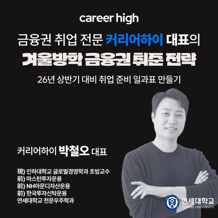 취업을 준비해야하는 시기인데, 어디서부터 무엇을 준비해야할지 모르는 것은 당연합니다. 커리어하이가 연세대 대학생/졸업생/취준생분들에게 취업전략 로드맵을 알려드립니다. 12월 29일 자정까지 하단의 포스터 QR코드 스캔 후 신청서를 작성해 주세요! 25년 12월 30일 오후 1시, 연세대학교 학생회관 세미나실 204호에서 만나요! - 금융권 취업의 공식, 커리어하이 - <img src="https://blogthumb.pstatic.net/MjAyNTEyMjJfMTU2/MDAxNzY2MzM0NTM5NTc4.E6YBVEA3L86hNawVS-0WhCmt-SVSO-uiseJVtMnmGn0g.bh2wU10tA0OH0pzecMac8NNRiKofnctbxWhJ72I1Uk4g.PNG/2512_%C3%EB%BE%F7%C0%FC%B7%AB%C6%AF%B0%AD_%BF%AC%BC%BC%B4%EB_%C6%F7.png?type=s3" />