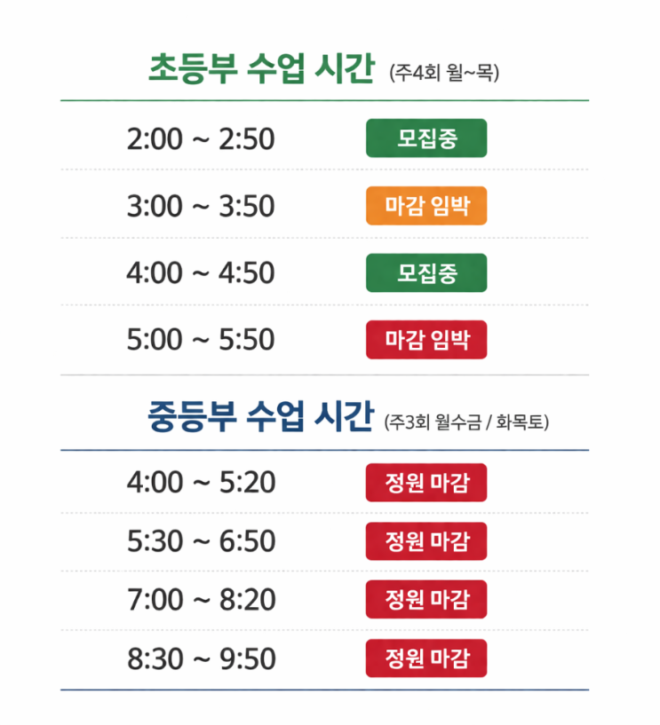 경북도청 수학의봄학원 2026년 수업시간표