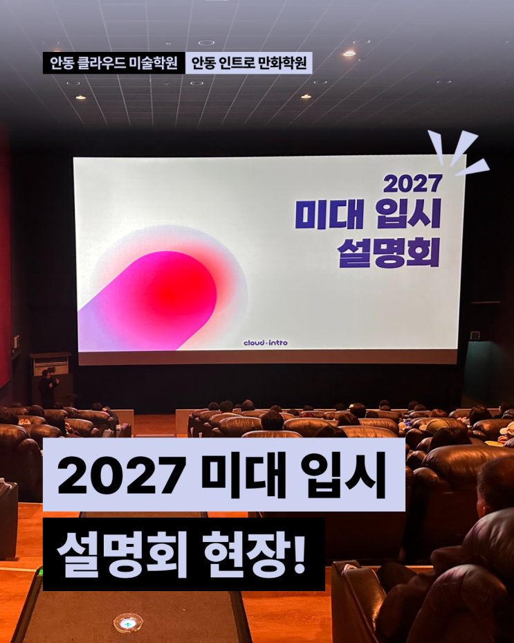 안녕하세요~ 안동 클라우드 미술학원 × 안동 인트로 만화학원입니다. 지난 3월 21일 토요일, 안동 옥동 롯데시네마 1관에서 2027 미대 입시 설명회를 무사히 끝마쳤습니다!! 현장 사진을 몇장 준비해봤는데요, 살짝 구경해보시죠~! 올해는 아쉽게도 공간이 협소하여 고3학생들과 학부모님들밖에 초대를 하지 못했는데요, 그래도 모두 끝까지 자리를 지켜주시며 경청해주셔서 너무 감사했습니다! 매년 입시가 조금씩 달라지는 부분이 있기에 잘 파악하여 준비하는 것이 중요한데요, 그만큼 선생님들께서도 유익한 정보들 위주로 준비했기 때문에 많은 도움이 되었으면 좋겠네요! 학생들 모두 올해 입시도 화이팅~! 끝까지 읽어주셔서 감사합니다 그....... <img src="https://blogthumb.pstatic.net/MjAyNjA0MDRfMjA2/MDAxNzc1Mjc0MjQ1OTk2.PZJIme26mMHZmqq_GxeOu7KCUatjOOgKK7n0GPNooCgg.DCBeHPzEluPVnXvMp8DSHAT7nzvDVzs-kl0vs2a6aKgg.PNG/1.png?type=s3" />