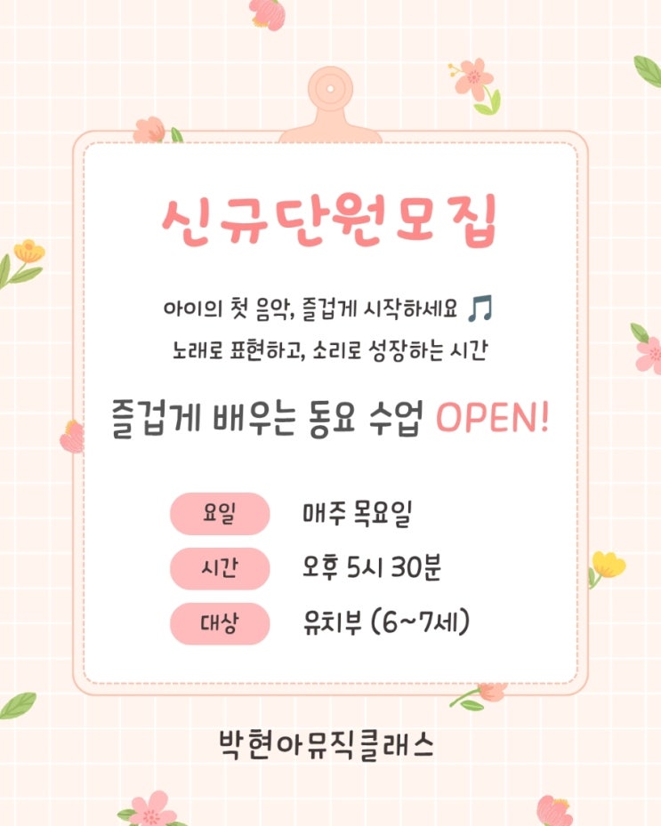 박현아뮤직클래스 동요수업반 OPEN 박뮤클에서 동요수업을 개설합니다^^ 유치부 초등부 모두모두 모여라~! 평일 - 목 오후 5시 30분 주말 - 토 오전 10시30분 동요 수업 왜 필요할까요~? 동요는 아이들의 언어 발달과 정서 안정에 큰 도움을 줍니다. 노래를 따라 부르며 자연스럽게 발음이 또렷해지고, 가사를 이해하며 상상력도 함께 자라납니다. 또한 친구들과 함께 노래하며 사회성과 자신감까지 키울 수 있는 소중한 시간이 됩니다. 우리 수업은 이렇게 진행됩니다 ✔ 몸으로 느끼는 음악 리듬에 맞춰 움직이고 표현하며 음악을 ‘몸으로’ 익힙니다. ✔ 이야기와 함께하는 동요 노래 속 이야기를 풀어보며 감정 표현을 자연....... <img src="https://blogthumb.pstatic.net/MjAyNjAzMjRfNjIg/MDAxNzc0MzE5NjU0OTU1.iZwIdfqDDfgYNIJotmihklHobCJkDDx05UWoD1RphLkg.MM8XjX7Ox7UFIGGTXU9sZS8Vhevx8sMfzgnt7qBPUb4g.JPEG/900%A3%DF%B9%DA%C7%F6%BE%C6%B9%C2%C1%F7%C5%AC%B7%A1%BD%BA%A3%DF20260318%A3%DF101804%A3%DF0000.jpg?type=s3" />