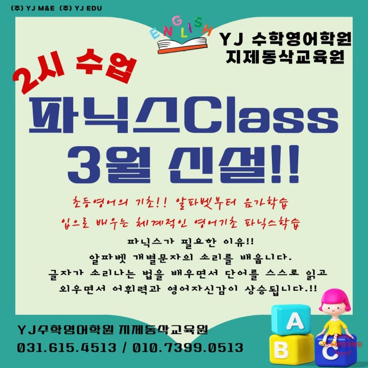 동삭동영어학원지제동영어학원초등파닉스반개강!!YJ수학영어학원