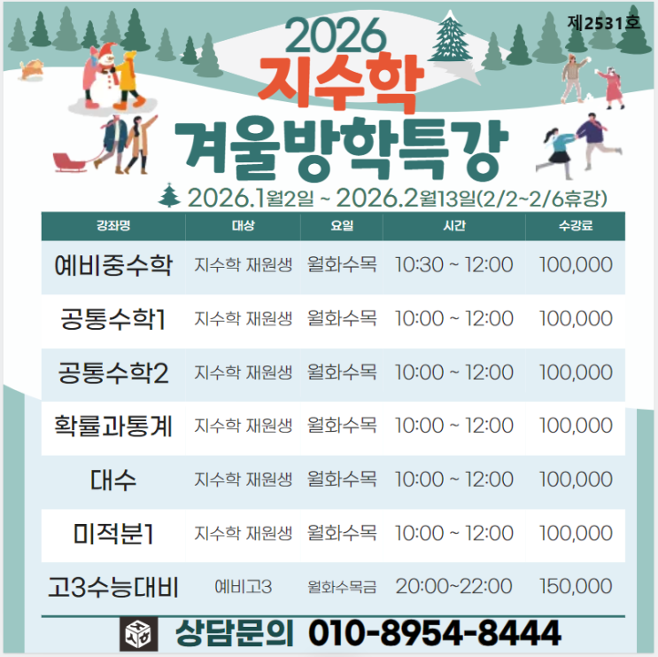 ☆★2026 지수학 겨울방학특강 ☆★ 방학을 보내는 방법이 성적을 결정한다. 개념총정리 특강주간TEST 누적개념정리 파이널 점검 방학이라도 적당히 쉬어야지;;;;; ☎️ 상담문의 010 8954 8444 <img src="https://blogthumb.pstatic.net/MjAyNTEyMTVfMjMw/MDAxNzY1ODA2NTY0Njkz.xFkXWB9c_3XGKaMXh3M2pNgZGUhAdp1bEiJOwqD6JcMg.O26Gq6PnKEH4ioJ91z4krT21_nsLh9R1SAZucI5L8Bkg.PNG/2026%B0%DC%C0%B2%B9%E6%C7%D0%C6%AF%B0%AD%282%29.png?type=s3" />