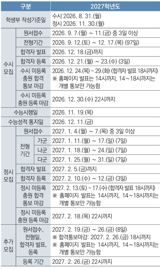 안녕하세요 토트학원입니다. 오늘은 2027학년도 대입 전형 전체 일정을 정리해보았습니다. 입시생들은 내용 캡쳐해놓고 필요할 때 마다 확인해주세요 !! 2027학년도 대입 전형 일정 핵심 요약 ■ 학생부 작성 기준일 수시: 2026년 8월 31일(월) 정시: 2026년 11월 30일(월) ■ 수시 모집 원서 접수: 2026년 9월 7일(월) ~ 11일(금) 중 3일 이상 전형 기간: 2026년 9월 12일(토) ~ 12월 17일(목) 합격자 발표: 2026년 12월 18일(금)까지 합격자 등록: 2026년 12월 21일(월) ~ 23일(수) 수시 미등록 충원 합격 통보 마감: 2026년 12월 29일(화) 18시까지 수시 미등록 충원 등록 마감: 2026년 12월 30일(수) 22시까지 ■ 수능 수능 시행일: 2026년 1....... <img src="https://blogthumb.pstatic.net/MjAyNTEyMTlfMjc5/MDAxNzY2MTI2MjM5NTE3.J_GfWgLuQV9mGcDvirQbUXBsHECtS89KjX1TbIET2XEg.WCoHU5eg-0tCogKSReF-3E7CJGKJ9RVgOYWOxxHrdO8g.PNG/%BD%BA%C5%A9%B8%B0%BC%A6_2025-12-19_%BF%C0%C8%C4_3.33.12.png?type=s3" />