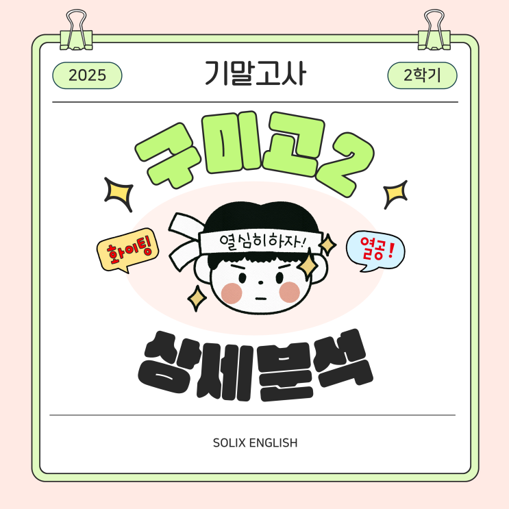 2025년 2학기 구미고 2학년 기말고사가 끝났습니다! 한 학년을 정리하는 시험이었던 만큼 어느 때보다 중요하게 느껴지지 않았을까 싶습니다. 이번 시험을 잘 분석해둔다면 내년 학습 방향을 다듬는 데에 도움이 될 수 있습니다. 솔릭스 영어학원이 분석한 시험 내용을 함께 살펴볼까요? 이번 시험은 교과서 비중이 높게 출제되면서도 부교와 모의고사를 고르게 활용해 기본 독해력과 응용력을 함께 점검한 구성이었습니다. 교과서에서는 순서, 지칭추론, 삽입, 내용일치 등 핵심 유형이 고루 출제되어 지문 구조와 문장 간 관계를 정확히 이해했는지가 중요하게 작용했습니다. 특히 5·6과에서 어법과 독해 유형이 함께 배치되어 문법 지식을 독....... <img src="https://blogthumb.pstatic.net/MjAyNTEyMTlfMzgg/MDAxNzY2MTMzNzY4NzE5.TA3u_G_nbhuCm5LMB_pnD2D-BBJ7KmKbEWXPVVt6giog.359i-lbEBxRqx9SzBI43pBuGL6IRYm4J1LZ-Y71Bw00g.PNG/1.png?type=s3" />