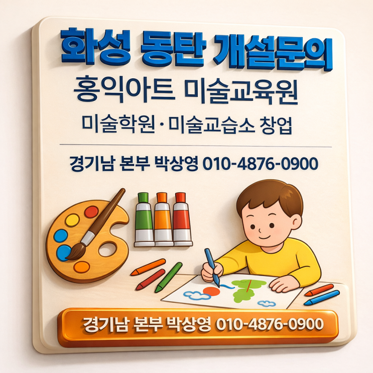 화성시 동탄 센트럴파크· 동탄2차푸르지오 홍익아트 미술학원·미술교습소·미술홈스쿨 창업 가맹** 화성 동탄6동은 동탄신도시 안에서도 생활 인프라와 교육 환경이 안정적으로 자리 잡은 지역입니다. 동탄1~3동이 초기 교육 수요를 빠르게 형성한 지역이라면, 동탄6동은 아이 연령대가 고르게 분포된 실거주 중심 동네라는 성격이 분명합니다. 그래서 이 지역의 미술교육 창업은 단기적인 유행보다 꾸준히 선택받는 구조가 중요합니다. 홍익아트 경기남본부장· 방문미술 영통지사장 박상영 010-4876-0900 (수원시 영통구·팔달구, 과천시, 안양시, 의왕시,오산시 홈스쿨 가맹 가능한 지역입니다.) 동탄6동 아파트 생활권이 만드는 교육 분위....... <img src="https://blogthumb.pstatic.net/MjAyNjAyMDVfOTkg/MDAxNzcwMjc4MjY4NTAw.NhGx0tw1t8JL0T0CnIjjsvf7K5bwvynAUleajLomkrkg.65PDkrs5j6flXO8zT0Hm2KhWw__34AE2zca704OL0I8g.PNG/%B5%BF%C5%BA3%C0%D4.png?type=s3" />
