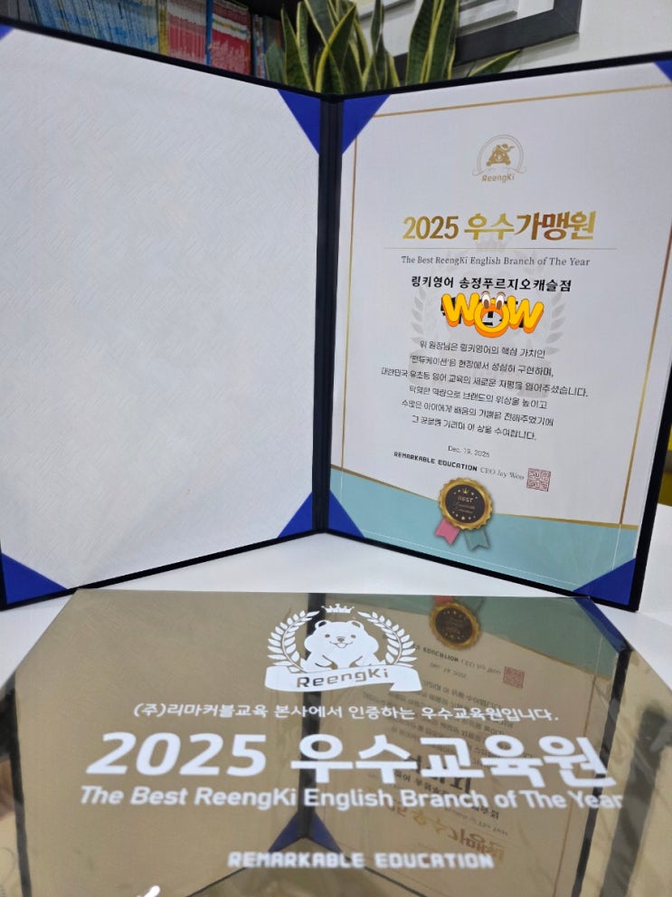 안녕하세요 링키영어 송정푸르지오캐슬점 원장 Celine 입니다. 올해는 아주 기쁜 소식과 함께 2026년을 시작해봅니다! 짜잔! 작년 한 해동안 열심히 링키 친구들과 달려와보니 이렇게 큰 상을 받게 되었어요~~ 이 모든게 늘 저와 함께 하는 링키 친구들과 늘 믿고 맡겨주시는 학부모님 덕분이에요 늘 꿈꿔왔던 상을 직접 받게 되니 너무너무 신나고 뿌듯하고 또또또 상받고 싶네요 ㅎㅎ 올해도 더욱 열심히 달려서 상을 받도록 해보겠습니다^^ 우수원 답게 아이들과 멋진 수업으로 보답하겠습니다! 정말 감사드립니다 <img src="https://blogthumb.pstatic.net/MjAyNjAyMDhfMjA1/MDAxNzcwNTYyNDU1NjMz.FqkSOfA75RG7paLxQ3MLQyEc_Nol2i7b8dylkZJ8sj0g.rVscH-PcN_LeO2ZICLgkN0Rd8rSGgKpRCP66zrcxv6kg.JPEG/900%A3%DF20260126%A3%DF132212.jpg?type=s3" />