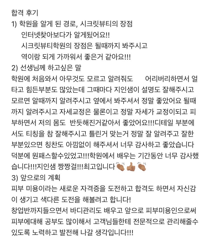 김 다 솜 님 합격을 진심으로 축하드립니다^^ 소중한 수강후기 정말 감사합니다^^ -시크릿뷰티미용학원- <img src="https://blogthumb.pstatic.net/MjAyNjA0MDNfMSAg/MDAxNzc1MTc3NDE4Mjcx.yONlUee8uZnKYEHi1bsGITT2_rNU_QgRL_PHFs9eyOEg.jwoLtDLCkB24_pq2YaGFbgFpD4F8hxvN0fKvPs3oHrsg.JPEG/KakaoTalk_20260402_163000642.jpg?type=s3" />