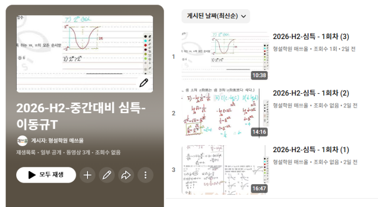 "2026-H2-중간대비 심화특강-(영상3개)"-[이동규T] "형설학원 매쓰올"(유튜브채널)을 통해 주요문항해설 및 수학수업영상을 언제든지 시청 및 다운로드 가능합니다. 강의를 다시 보면서 모르는 개념이나 해결하지 못한 문제들을 영상을 통해 재학습 하므로써 학습의 누수 없이 탄탄한 실력을 갖을수 있도록 도움을 받을수 있습니다. 또한 "자기주도적 학습습관"을 들이는데도 효과적 입니다. 형설 학원 수업문의 신청 ▶ 수업문의신청 콜백시간 : 월~금 14~22시 , 토~일 12~22시 (휴무일 홈피공지사항 참조) 형설 학원 카톡문의 ▶ 카톡채널 운영시간 : 월~금 14~22시 , 토~일 12~22시 (휴무일 홈피공지사항 참조....... <img src="https://blogthumb.pstatic.net/MjAyNjA0MDdfMTU1/MDAxNzc1NTY0MjM1MjAz.6Uxi17dYNOlmymp0pdkqvoOdtjhJu65POv-ZlZBIPB4g.kp9yZd-NUekY8jRmhwilSevv3M3NQWFBnFF5fLWJlKUg.PNG/image.png?type=s3" />