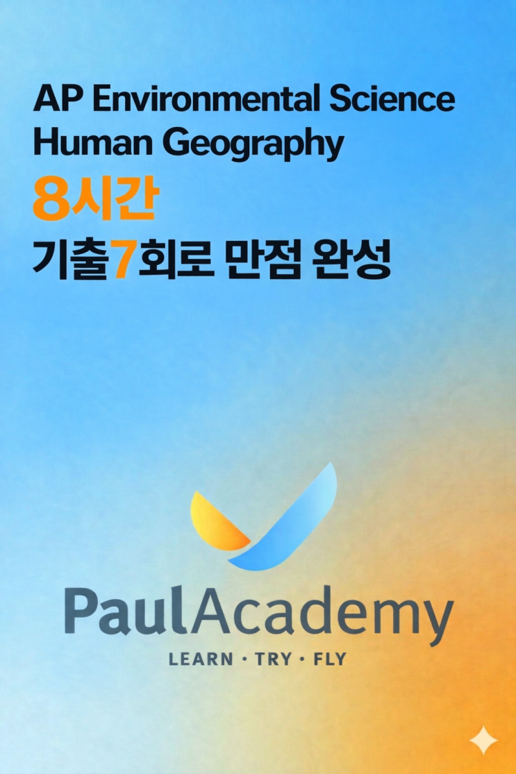 AP Human Geo / Environmental Science가 쉽다고 해서 수강을 했는데, 5점에 대한 확신이 없는 경우가 대다수입니다. 게다가 이 과목들은 기출문제 구하기도 만만치 않습니다. 이런 어려움을 겪는 학생들을 위해서 4회 수업 + 기출 7회 풀이 구조로 AP 만점을 완성하는 문풀반을 오픈합니다. 수업 일정 (4회 완성) 4/4(토) 4/11(토) 4/18(토) 4/25(토) 총 4회, 회당 2시간 총 8시간 집중 수업 과목 구성 15:00–17:00 → AP Environmental Science 17:00–19:00 → AP Human Geography 커리큘럼 핵심 구조 1️⃣ 수업 전 과제 기반 학습 매 회차마다 기출 문제를 미리 풀어오게 합니다 단순 수업이 아닌 실전 상태에서....... <img src="https://blogthumb.pstatic.net/MjAyNjAzMjdfNTYg/MDAxNzc0NTk0NzY2NDUw.VMN_qo6q753sLDKwRiWn9AZaTogjXD5y7S0joJDsYOMg.g6_cElgFgLh75WlOUi1vjoBP85LaAZY9OJ96RwebNgwg.PNG/ChatGPT_Image_2026%B3%E2_3%BF%F9_27%C0%CF_%BF%C0%C8%C4_03_59_18.png?type=s3" />
