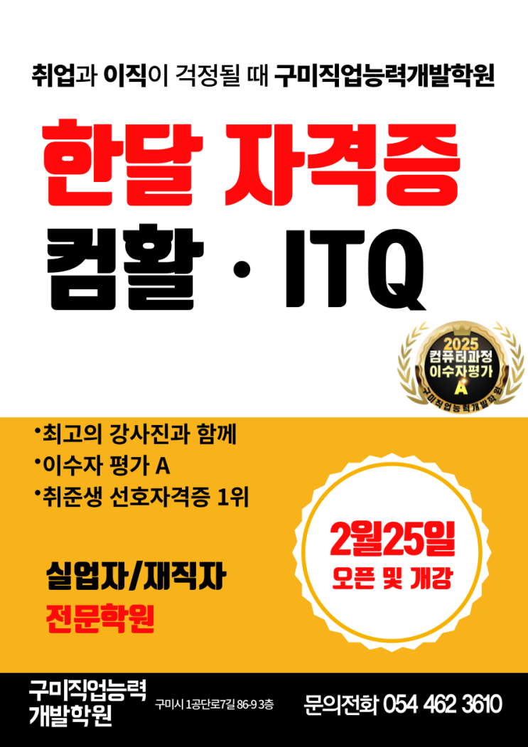 안녕하세요 직능입니다 20~30대 취업·이직 준비생을 위한 한달 자격증 과정 안내 취업을 준비하거나, 이직을 고민하고 계신 20~30대라면 “자격증 하나쯤은 있어야 하지 않을까?”라는 생각, 한 번쯤 해보셨을 겁니다. 하지만 오래 걸리는 자격증은 부담스럽고 당장 실무에 도움이 되는 자격증이 무엇인지도 고민되고 학원 선택도 쉽지 않은 게 현실입니다. 이런 고민을 하고 계신 분들을 위해 구미직업능력개발학원에서 ‘컴퓨터활용·ITQ 한달 자격증 과정’을 개설했습니다. 왜 컴퓨터활용·ITQ 자격증일까요? 20~30대 취업·이직 시장에서 사무·행정·관리·기획 직무를 준비하신다면 컴퓨터 활용 능력은 이제 선택이 아니라 기본 역량....... <img src="https://blogthumb.pstatic.net/MjAyNjAyMTBfMTU2/MDAxNzcwNjk0ODU4NTEw.X2iNzeWRQmJpmdkPSy8CiOcpbhVdqW3lR4lCYAoT-8kg.47gXUQ0LlBcF8nW4cm38t2IxNZqYQ_ycLNfi-sZKvJEg.PNG/%B0%AD%C1%B6-%C6%F7%BD%BA%C5%CD-002.png?type=s3" />