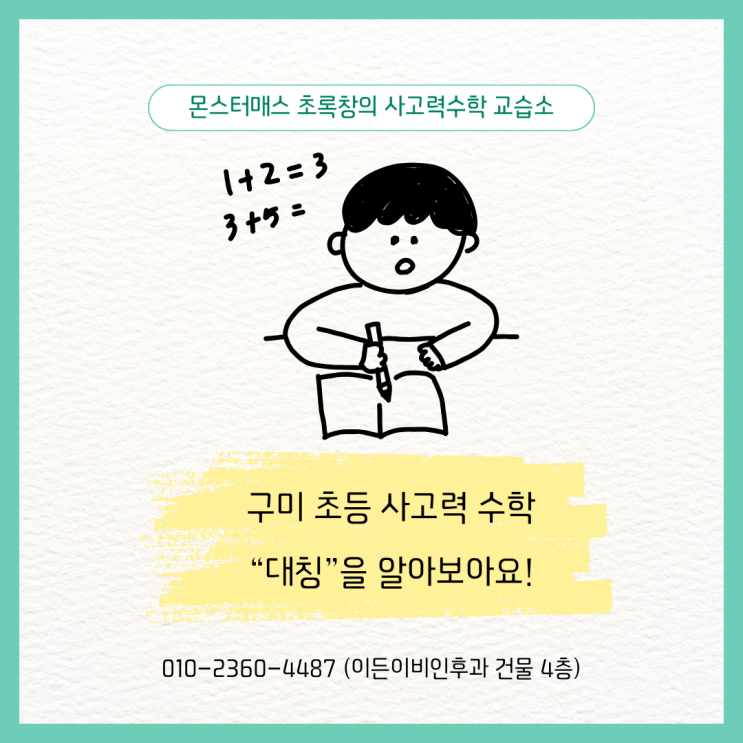 안녕하세요. 구미 도량동 도봉초등학교 근처에 위치한 초등 수학 전문 몬스터매스 초록창의 사고력수학 교습소 여리쌤입니다. 초등 수학은 양으로 학습하는 시기는 아닙니다. 수학적 기초 개념을 이해하고 풀이에 응용할 수 있도록 배우는 시기이지요. 수학은 추상적인 학문이기 때문에 아이들이 쉽게 이해할 수 있도록 "교구"를 사용해야 합니다. 도형 학습은 대부분 초등 3학년부터 시작되지만 어릴수록 단순 반복 계산이 아닌 도형 혹은 교구를 가지고 배워야 됩니다. 여러 교구를 만져보고 탐색하며 여러 조작 활동을 통해 수학적 개념을 직관적으로 체득이 필요합니다. 몬스터매스는 다양한 교구를 활용하여 "생각하는 힘&qu....... <img src="https://blogthumb.pstatic.net/MjAyNjAyMTFfMjM1/MDAxNzcwNzkxNzc4Mzg5.6jzbNJu-6ICKvARlgZ5Z1DMPcq6V0Hw_O98PjfjdeoIg.Ta-LPIo-qeWcf2N9NvQWSOFWuhIib5PbYfvLOM9NmBQg.PNG/%B9%CE%C6%AE_%B3%EB%B6%FB%BB%F6_%BD%C9%C7%C3%C7%D1_%B9%CC%BC%FA%C7%D0%BF%F8_%BE%C8%B3%BB_%C0%CE%BD%BA%C5%B8%B1%D7%B7%A5_%B0%D4%BD%C3%B9%B0.png?type=s3" />