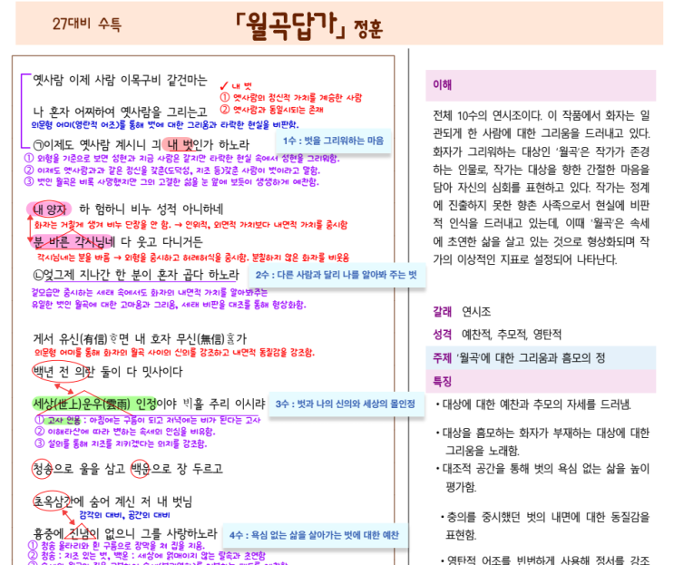 월곡답가(정훈) 1 [ ○ , × ] <제1수>에서 화자는 ‘이목구비’가 같다는 점을 근거로 현재에도 ‘옛 사람’의 정신을 지닌 인물이 존재할 수 있다고 판단하고 있다. 답: ×해설:<제1수>에서 ‘옛 사람 이제 사람 이목구비 같지마는’이라고 하여 외형은 같다고 했으나, 화자는 외형(이목구비)을 근거로 판단하는 것이 아니다. ‘나 혼자 어찌하여 옛 사람을 그리는고’에서 대부분의 사람들이 옛 사람의 정신을 갖추지 못했음을 한탄하며, ‘이제도 옛 사람 계시니’라고 하여 월곡이라는 예외적 존재를 발견했음을 밝힌다. 외형이 아닌 정신적 가치를 기준으로 판단한다. 2 [ ○ , × ] <제2수>에서 화자가 ‘비누 성적’을 하....... <img src="https://blogthumb.pstatic.net/MjAyNjAyMDhfMjM2/MDAxNzcwNTQ5OTE5MzA5.7VuzpU7gI56S6fc4lbQPwgPbkiLoX29ru_4RvjDqKHQg.Ivt66s19CLErWf6RnxPV7DJVAYj_8nsxuzWmFmscSH0g.PNG/image.png?type=s3" />