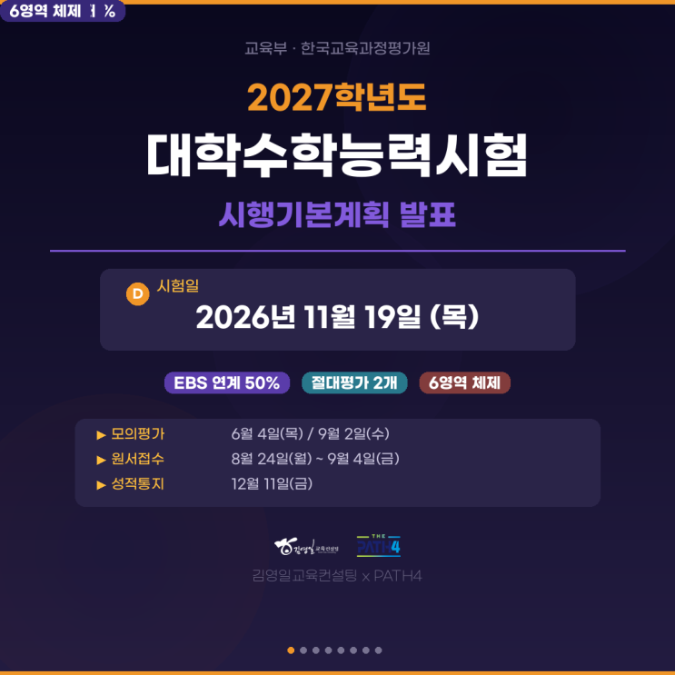 2027학년도 수능 시행기본계획 발표! 교육부·한국교육과정평가원에서 발표한 2027학년도 대학수학능력시험 핵심 내용을 정리했습니다 시험일: 2026년 11월 19일(목) ✅ 주요 포인트 요약 ▸ 6영역 체제 유지 (국어·수학·영어·한국사·탐구·제2외국어/한문) ▸ EBS 수능 연계율 50% ▸ 영어·한국사 절대평가 ▸ 국어·수학 선택과목 전략이 핵심! 모의평가 일정 ▸ 6월 모의평가: 2026.6.4(목) ▸ 9월 모의평가: 2026.9.2(수) 수험생 필수 체크 ▸ 온라인 사전입력: 8.20~9.3 (mycsat.re.kr) ▸ 원서접수: 8.24~9.4 ▸ 성적통지: 12.11(금) ▸ 컴퓨터용 사인펜 시험장 지급 + 개인 지참 가능 ▸ 샤프심 0.5mm 흑색 개인 휴....... <img src="https://blogthumb.pstatic.net/MjAyNjA0MDFfMTMg/MDAxNzc1MDMzMTM1Nzcx.FDSNNfeJrmm32LOWnMDTMw3yPV16nim2XsUnxkoA1hMg.ga9W20FNaQMvYdoS4sdOTl1krx9529oJ8VKFopTlOK4g.PNG/01_%C7%A5%C1%F6.png?type=s3" />