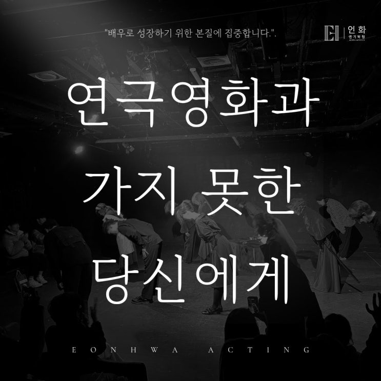 안녕하세요, "배우로 성장히기 위한 본질에 집중하는 곳" 언화 연기학원 교육팀장입니다. 오늘 이 글은, 원하는 연극영화과에 가지 못했다는 이유로 스스로를 조금 낮춰보고 있는 분들에게 드리고 싶습니다.▼ "학교 이름이 아니라, 그 이후가 당신을 만든다" 연극영화과 입시는 분명 중요합니다. 하지만 더 중요한 건, 그 이후의 시간입니다. 실제로 현장에서 오래 살아남는 배우들을 보면 출신 학교보다 더 크게 작용하는 건 딱 세 가지입니다. 함께 작업하는 사람들 지속적으로 쌓이는 결과물 현장에서 연결되는 관계 학교는 그 시작점일 뿐입니다. 결국 배우를 만드는 건 '이름'이 아니라 '과정'입....... <img src="https://blogthumb.pstatic.net/MjAyNjA0MDJfMTUx/MDAxNzc1MTE0NTY1NTU3.-9v9Y06BjNSJJYUPVWym-27aZmBONsTHJm0nRNemJe8g.Qo_8SuLIpV1hYg0bOlc3JMtl8mgIlQe_Ijy3t_n6vvog.JPEG/%BF%AC%B1%E2_%BA%ED%B7%CE%B1%D7_%BD%E6%B3%D7%C0%CF.jpg?type=s3" />
