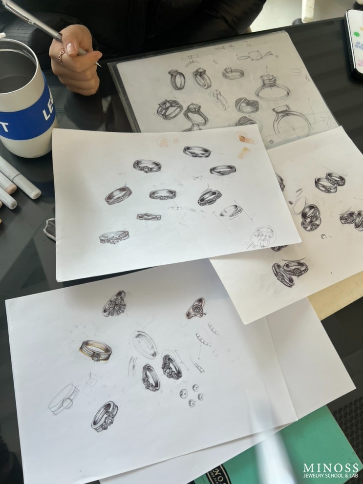 대한민국 주얼리 시장의 핵심 '종로' 주얼리의 메카! 주얼리 디자이너로 일하기 위한 실전형 주얼리 스케치는 과연 어떻게 이루어질까요? 현직 디자이너들도 다시배우는 미노스 핸드드로잉 스케치 클래스 3개월만에 이만큼 실력이 늘었답니다!! 여러 장의 종이를 가득 채운 디자인 스케치! 우와! 감탄이 절로 나오는데요? 자세히 보니 커플링부터 다이아 솔리테어링까지 다양한 실전 디자인들이 모여있습니다! 하얀 도화지 위해 그려낸 커플링 디자인! 여러 가지 디자인 스케치는 고객의 니즈와 시장의 선호도를 고려하면서도 개인의 색깔을 녹여가며 만들어낸 멋진 작품입니다! 이번엔 꼬임 형태를 사용한 다이아 반지군요! 세팅 위치....... <img src="https://blogthumb.pstatic.net/MjAyNjAzMzBfMjI3/MDAxNzc0ODM3ODM3ODAz.Jbffl3kMBHMCfAFav27QpvlWNXjWaYWL0EeLPDJFc3gg.pqwnF--T8XiIIykK_muGOYpefV7nyLlb4Lw-Xkf5xvcg.JPEG/IMG_8285.jpg?type=s3" />