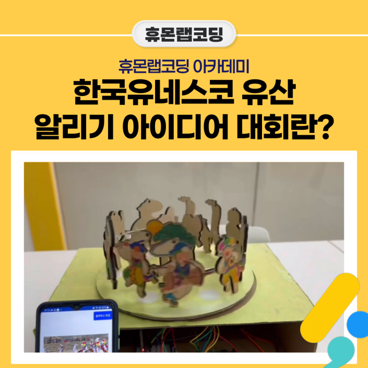 안녕하세요! 스스로 생각하는 힘을 키우는 휴몬랩코딩 아카데미 입니다. 어느덧 3월 말이 다가오며 교내 발명대회, IT 코딩 발명 아이디어 대회 등 많은 대회의 제출 기한이 마무리되고 있습니다. 하지만 누구에게나 바쁜 3월, 발명대회 준비를 하지 못한 분들도 많으실 텐데요. 다행히 앞으로도 다양한 발명·아이디어 대회가 계속 예정되어 있습니다. 그중에서도 발명대회 하면 떠오르는 대표적인 대회, 유네스코 유산 알리기 아이디어 대회를 소개해드리겠습니다. 유네스코 유산 알리기 아이디어 대회란? 유네스코 유산 알리기 아이디어 대회는 한국의 모든 유네스코 유산에 대하여 전 세계에 널리 알리고자 하는 획기적인 아이디어를 기획하는....... <img src="https://blogthumb.pstatic.net/MjAyNjAzMzFfMjY4/MDAxNzc0OTMyMzg3MzU5.TqI9uuYHxqIC49Y0dnyCAptuh4bZfiCFh30Nd1GulWkg.6O_T-0FURCC1QTyns0uLVgRl68Rf70idV0ie-Lc2VwQg.PNG/%BA%ED%B7%CE%B1%D7-2-004.png?type=s3" />