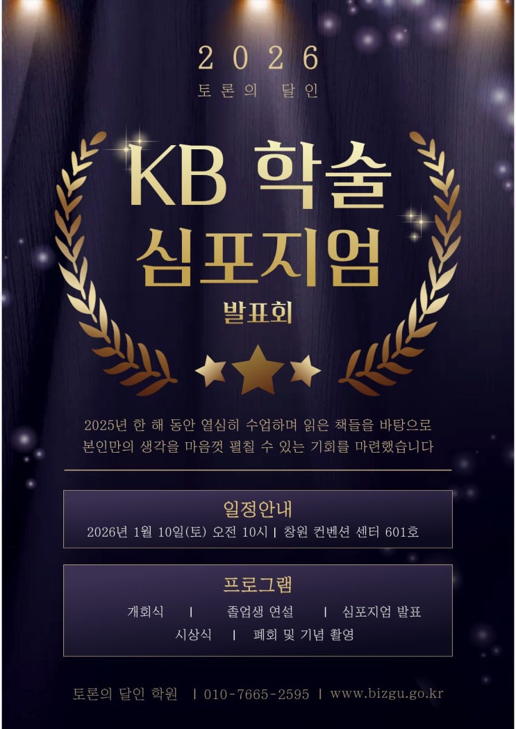 안녕하세요. 토론의 달인입니다. 오랜 시간 준비해 온 KB학술제가 많은 분들의 관심과 응원 속에 성공적으로 마무리되었습니다. 이번 학술제는 단순한 발표 행사를 넘어, 아이들이 그동안 쌓아온 학습 과정과 사고의 깊이, 그리고 스스로 성장해 온 흔적을 직접 보여주는 의미 있는 자리였습니다. 여름부터 차근차근 기획해 온 이번 KB학술제는 ‘결과를 보여주기 위한 행사’라기보다, 아이들이 스스로의 노력과 변화를 증명해 내는 무대가 되기를 바라는 마음으로 준비되었습니다. 그 취지가 현장에서 고스란히 전달된 것 같아, 행사가 끝난 지금까지도 큰 여운과 감사함이 남아 있습니다. 행사 당일에는 예상보다 훨씬 많은 학부모님들께서 참....... <img src="https://blogthumb.pstatic.net/MjAyNjAxMTJfMjI5/MDAxNzY4MTgxMjgyMjYz.0dYOD5b-IO0QCDWqsh9N88q66wGEHu8uQT5gKTmZDxUg.gKWWClmnrwIXskbmzbLbHecuftyDiXvDp1kwEcqpIAkg.JPEG/%BD%C9%C6%F7%C1%F6%BE%F6_%C6%F7%BD%BA%C5%CD%28A3%29.jpg?type=s3" />