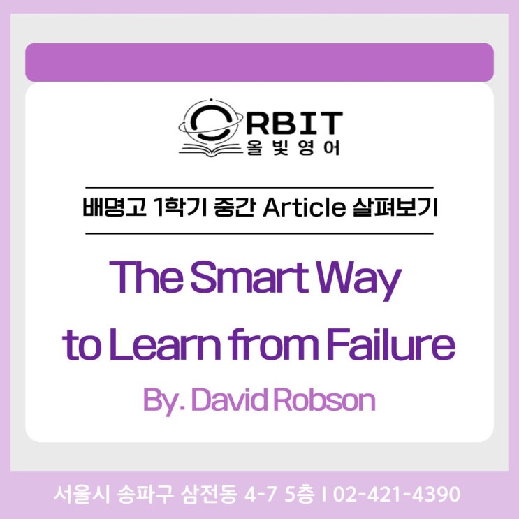 안녕하세요! 잠실학원사거리 중고등 영어전문 올빛영어입니다! 올빛영어는 벌써 중간고사 대비 수업이 절반가량 진행되고 있는 시점인데요. 오늘은 이번 배명고 2학년 중간고사 대비 범위 중 흥미로운 Article이 포함되어 있어 이 글과 관련한 포스팅을 진행해볼까 합니다. Article의 내용은 '실패의 심리학'에 관한 글입니다. "실패는 성공의 어머니"라는 말은 누구나 알지만, 왜 정작 우리는 실패 앞에서 무너지고 같은 실수를 반복할까요? 지문의 핵심 내용을 정리하며, 내신 만점을 위한 포인트까지 짚어보겠습니다. 우리가 실패를 통해 배우지 못하는 두 가지 이유 기사에서는 우리가 실패로부터 학습하는 것을 방해하....... <img src="https://blogthumb.pstatic.net/MjAyNjAzMjRfMTc3/MDAxNzc0MzU4NTIyMDI4.7tCfTqMVmnDKA5GnrlvyU8NqZuTJK-oPVmMwThAz3ugg.257k_mVfB2WeRZ-R5trwzUA-Cw4NQA2zYi9V-8Cp0bgg.JPEG/%BA%ED%B7%CE%B1%D7_%C7%A5%C1%F6_%2815%29.jpg?type=s3" />