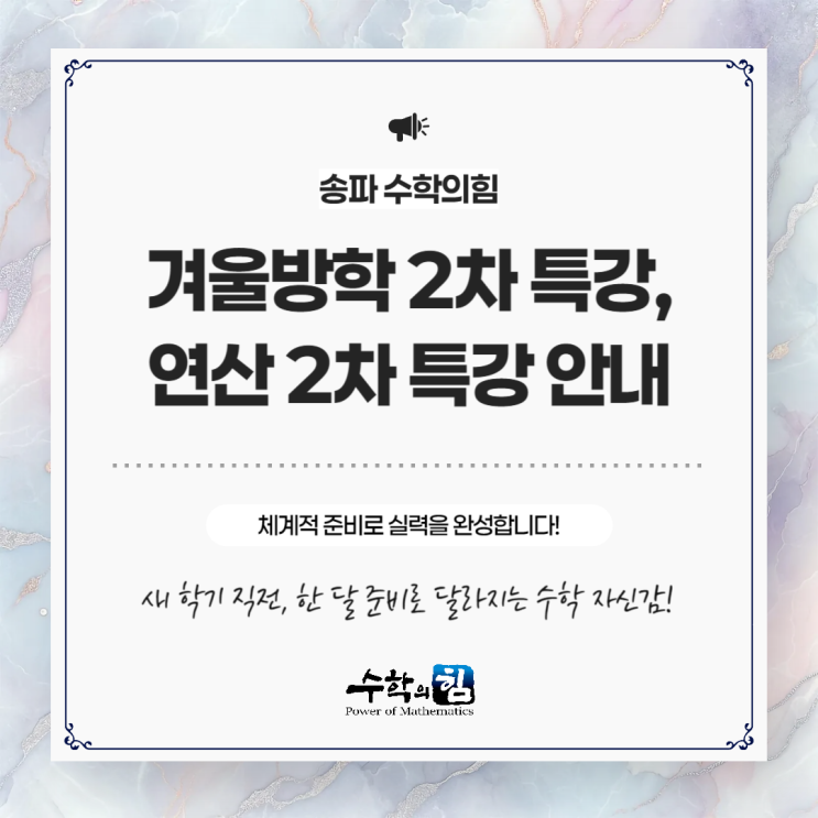 안녕하세요:) 송파 석촌동 헬리오시티 책 박물관 앞에 위치한 초등·중등·고등 수학전문학원 송파 수학의힘입니다. 새학기 시작까지 약 한 달 남은 시점에는 어떤 학습 계획을 세우고 준비할지가 특히 중요합니다. 이번 2차 겨울방학 특강은 앞서 진행된 1차 특강과는 별도로, 아이들의 부족한 부분을 집중적으로 보완하고, 새학기 학습 준비를 보다 탄탄히 할 수 있도록 준비되었습니다 ✨ 특강 시작일은 2026년 2월 9일부터입니다! ✏ 연산 집중 특강 대상: 초등학생 전 학년 일정: 월~금 / 10:30 ~ 12:00 연산은 모든 수학 학습의 기본입니다! 따라서 이번 특강에서는 빠르고 정확한 계산 훈련과 함께 문제를 스스로 해결할 수 있는....... <img src="https://blogthumb.pstatic.net/MjAyNjAyMDVfMjU5/MDAxNzcwMjY2NTE1MDgz.y-wFx8uYsZfigrgc_w7WVxDnw2g5ExoSBRmBlnBIvFUg.ilW37mU5BoPplfonaWJHqVwHR2Taw8Mqja-nucNKJy8g.PNG/%C7%D8%B4%A9%B8%AE%C3%CA_%BC%F6%C7%D0%C7%D0%BF%F8-001.png?type=s3" />