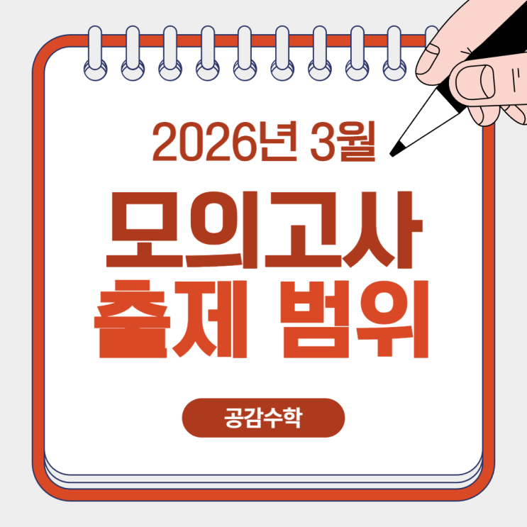 안녕하십니까 공감수학 윤쌤 윤석원입니다. 이제 다음 주 설 연휴가 끝나면 곧 새 학기가 시작됩니다. 2026년 첫 모의고사인 3월 모의고사 수학 출제 범위에 대해 안내드리겠습니다. 고3 수학 출제 범위 고3의 경우 처음으로 공통과목 전범위로 된 시험을 보게 됩니다. 그리고 선택과목 문제도 출제되는데 확통의 경우는 경우의 수, 미적의 경우는 수열의 극한, 기하는 이차곡선까지 출제됩니다. 고3이 되고 보는 첫 시험이므로 착실하게 준비합시다. 고1, 고2 출제 범위 고2는 공통수학 1, 2의 전 범위, 고1은 중학교 과정 전 범위가 출제됩니다. 새 학기를 준비하며 공부하는 범위와 차이가 있습니다. 이전 내용에 대하여 복습하고 모든 개념을....... <img src="https://blogthumb.pstatic.net/MjAyNjAyMDdfMTE2/MDAxNzcwNDIwMzI1NzIw.c27scvaHnyn4mPzl0WcYWovLf0qWCQxRZuJBah0-Cuwg.M7aQv-fKt63j_DFrCtLCRkg642aHx7YeRe3GRYtmt9Qg.PNG/%C1%A6%B8%F1%C0%BB_%C0%D4%B7%C2%C7%D8%C1%D6%BC%BC%BF%E4_-001_-_2026-02-07T082341.579.png?type=s3" />