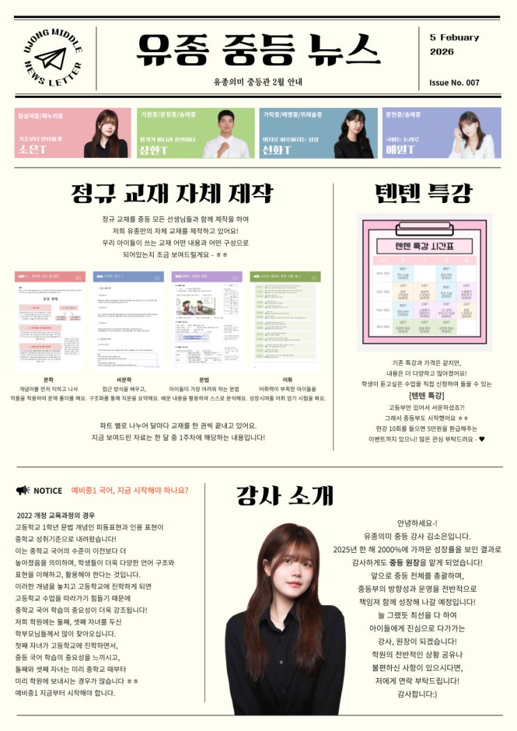 안녕하세요! 유종의 미 중등쌤입니다 - 2월호 유종 중등 뉴스레터를 소개합니다! https://blog.naver.com/ujong0301/224163134030 텐텐 특강은 위 블로그 내용을 참고 부탁드립니다! 감사합니다 :) 추가적인 상담을 원하시는 분들은 010-3264-1298 (전관 공통 번호)로 문의 혹은 네이버 상담 예약을 통해 예약해주시면 됩니다! <img src="https://blogthumb.pstatic.net/MjAyNjAyMDdfODEg/MDAxNzcwNDY1NTAwNzIx.UwDvFale8PKVGuzw_ib2ER3IvJORz164SlsVLEpHNyog.qpc-eI4Svn6Et0Vn_QVYe6qojxbhR5NY4ctIh1cLbEkg.JPEG/%C1%A6%B8%F1%C0%BB-%C0%D4%B7%C2%C7%D8%C1%D6%BC%BC%BF%E4_-002_%281%29.jpg?type=s3" />