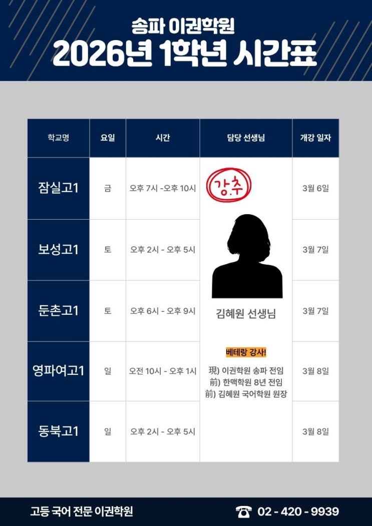 3월 들어가면 아이들이 적응하느라 학습 리듬 잡기가 늦어지는 경우가 많습니다. 그래서 2월 연휴 전, 중1~3 학년별 정규반은 자리 선점 상담 + 진단 후 맞춤 방향으로 안내드리고 있어요. 무조건적인 선행보다, 아이가 설명할 수 있는 기반부터 안정적으로 잡아드립니다. ✔️대상 : 중1 ~ 중3 ✔️ 정규반 특징 - 학년별 진단 후 수업 반 배정 - 내신 대비 핵심 단원 연결 학습 - 매 수업 풀이 과정 점검 + 약한 유형 보완 - 서술형 대비 및 풀이 습관 강화 - 학교별 기출 분석으로 내신 준비 철저 - 학부모님께 매 수업 후 학습 피드백 안내 ✔️ 수업 일정 - 상시 등록 가능 (레벨별 정규반 운영 중) → 2/13까지 신학기 자리 선점 상담 우선 진행 - 등록 후 3월 대비 학습 방향을 개별 안내 ✔️ 신청 방법 네이버 예약 - 플레이스(지도) 내 상담 예약하기 ✔️ 안내사항 - 수준별로 반이 운영되어 상담 후 반 배정됩니다. - 소수 정원으로 운영되어 원하시는 시간대는 조기 마감될 수 있어요. - 상담 시 최근 성적 / 오답 노트 / 문제집 등) 지참하시면 정확히 안내 가능합니다.