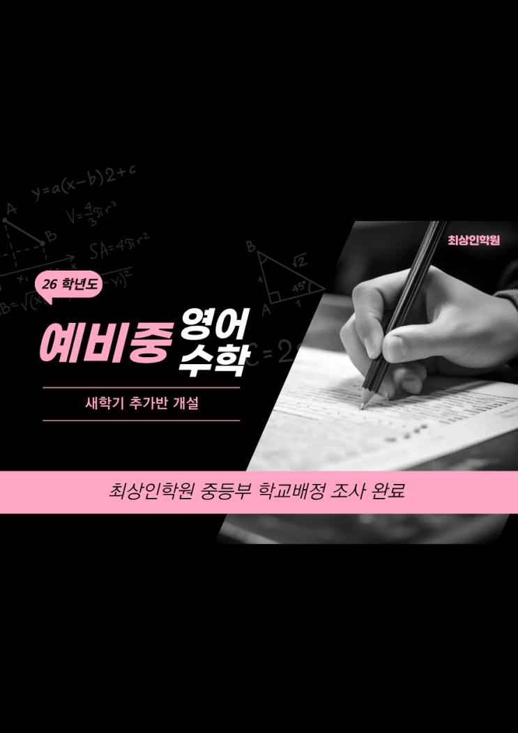 안녕하세요. 성내동 영어수학 학원 최상인학원입니다. 2026 예비중등 중학교 배정조사가 완료되었습니다. 중학교 배정조사 완료에 따른 학습 준비 시점 2025학년도 중학교 배정조사가 완료되면서 학생별 진학 학교가 구체적으로 정해졌습니다. 중학교가 확정되는 시점은 단순한 행정 절차의 종료가 아니라, 실질적인 내신 준비가 시작되는 시점이라는 의미를 가집니다. 학교별로 교과 진행 속도, 시험 범위 설정 방식, 서술형 문항 비중과 평가 방식에는 차이가 있으며, 이에 따라 학습 준비 방향 또한 달라질 수밖에 없습니다. 예비중등 시기에 진학 학교를 기준으로 학습 방향을 미리 설정하는 것은 중학교 입학 후 첫 시험에서의 적응 속도와....... <img src="https://blogthumb.pstatic.net/MjAyNjAyMDRfMjEz/MDAxNzcwMjA2Mjc2MjU5.Alo505-BQIZ2xVpOoipd40LCdT7GSpzxlBcV60LpEG8g.GPA1N3mkJxs6_3Flpe-zOgrfLusWD72Nh34wXhomC6Eg.PNG/%C0%B1%BC%F6%C1%A4%C0%BD%BE%C7%C7%D0%BF%F8_%B7%CE%C3%BC%C5%D7_%281%29.png?type=s3" />