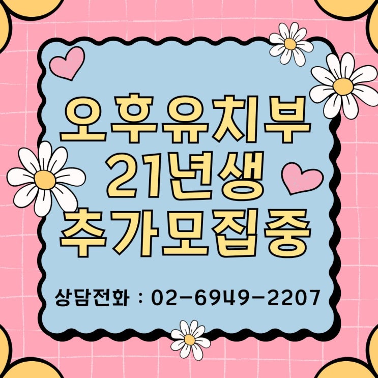 안녕하세요, VICKIDS입니다 아이들이 즐겁게 영어를 접하면서도 자연스럽게 말하기와 기초 학습을 함께 잡을 수 있는 오후유치부 21년생 반을 추가 모집합니다. 수업 특징 ✔️ 영어에 대한 자신감 ✔️ 말하기 습관 ✔️ 기초 읽기 능력 VICKIDS 오후유치부는 단순히 즐겁기만 한 영어가 아니라 학습 능력까지 함께 키워가는 수업입니다. 이런 친구들에게 추천드려요 ✔️알파벳을 알고 있는 친구 ✔️알파벳 개별 음가(소리)를 이해하고 있는 친구 기본적인 파닉스 준비가 되어 있는 경우 수업 적응이 훨씬 원활합니다 VICKIDS만의 강점 ✔️소규모 맞춤 수업 ✔️아이 한 명 한 명을 세심하게 관찰 ✔️즐거운 활동....... <img src="https://blogthumb.pstatic.net/MjAyNjAzMzBfMTc3/MDAxNzc0ODY1MDU3NDAw.SUCy-E4jzq5vK1YilM9tDH6USUOwMlxrc5vyCtAJh8cg.n7dX3wizBrL6zak3LWI5H_rs5EyUBsbD2VY8OMj97w8g.JPEG/Blue_and_Pink_Cute_10.10_Super_Sale_Instagram_Post.jpg?type=s3" />
