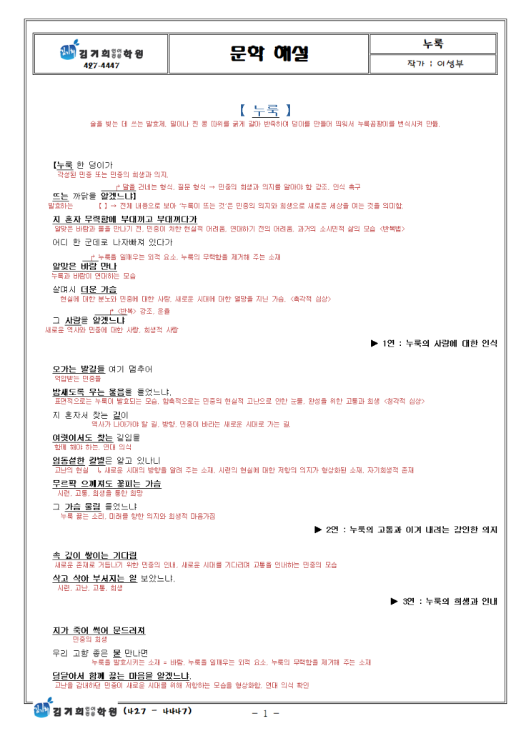 [ EBS 수능특강 문학 해설 ] 【 누룩 】 - 이성부 ❚ 개관(槪觀) ❚ 알맞은 바람과 고향의 좋은 물 만나 사랑과 춤과 기쁨과 해솟는 얼굴도 되는 누룩의 힘 희생과 연대를 통해 새로운 시대를 이끌어내는 민중의 힘 의인, 희생, 부정, 민중, 누룩, 혼자, 희생, 대, 압, 징, 항, 망, 정, 희생, 민중, 시대, 의인, 음, 징, 설, 문, 결, 복, 율, 말 <img src="https://blogthumb.pstatic.net/MjAyNjAzMTNfNTcg/MDAxNzczMzgwNjI5Mzc0.ECk8qJidQjWb1A7aM7kiIEFtoB7zZoGh_TKXNPpNdUUg.yK1jA1P6BJynybeMgJX74XpyWXpvQDzb1shPAnsODLUg.PNG/%B4%A9%B7%E8_%28%C0%CC%BC%BA%BA%CE%29_%C7%D8%BC%B3001.png?type=s3" />