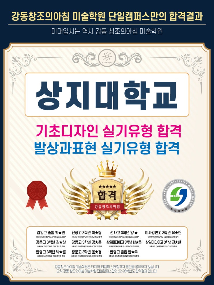 상지대학교 합격을 진심으로 축하합니다! 강동창조의아침 미술학원은 오직 강동 단일캠퍼스에서 합격한 합격자 명단만을 사용합니다! 타지역, 타캠퍼스와 명단을 공유하지 않습니다! <img src="https://blogthumb.pstatic.net/MjAyNjAzMTZfNTEg/MDAxNzczNjM4NDUxMjMx.9t5zg5DUl7nszjvjHigjmTFNu5vOwZfsxSpRo3ZR7Pcg.xUHvmZYNAowySOtZbmu68ncfNK_U1hrWWpk2TJPCgbkg.JPEG/24-%BB%F3%C1%F6%B4%EB.jpg?type=s3" />