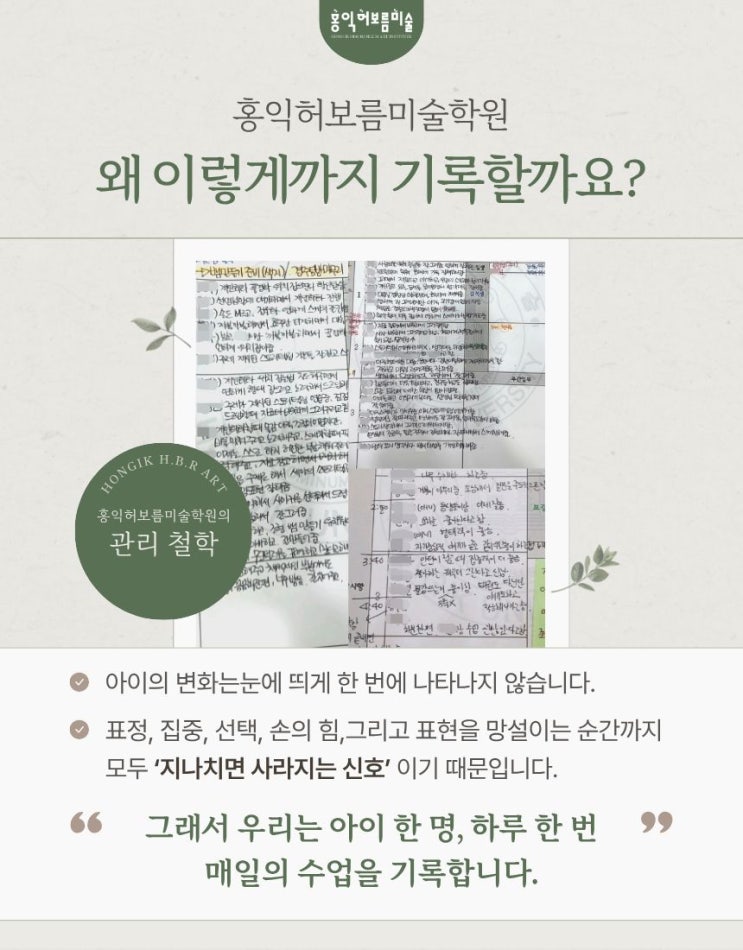 미술 수업은 왜 이렇게까지 기록이 필요할까요? 진주평거동미술학원인 홍익허보름미술학원을 찾으시는 부모님들께 가장 많이 듣는 질문 중 하나가 있습니다. “왜 이렇게 기록을 많이 하시나요?”라는 질문입니다. 미술은 한 번의 결과로 아이를 판단하기 어려운 과목입니다. 특히 유아와 아동의 미술은 그림 한 장보다 그 과정 속에 더 많은 정보가 담겨 있습니다. 아이가 망설였던 순간, 선택을 바꾼 이유, 집중이 흐트러졌던 지점, 다시 몰입했던 계기까지 모두 아이의 발달과 연결되어 있기 때문입니다. 그래서 진주평거동미술학원인 홍익허보름미술학원에서는 수업이 끝날 때마다 아이 한 명, 한 명에 대한 수업 기록을 남깁니다. 그날의 수....... <img src="https://blogthumb.pstatic.net/MjAyNjAyMDlfMjEz/MDAxNzcwNjI3MDAwMDAx.AZfYBu6ODxIaCag-U6A9Zs7ZxxhSSslpRClXq9ROGFIg.6wyzcSm8Be5tnRsR8_eCdA8JFkCMwpjO9ruNt-_BdXIg.JPEG/1.jpg?type=s3" />