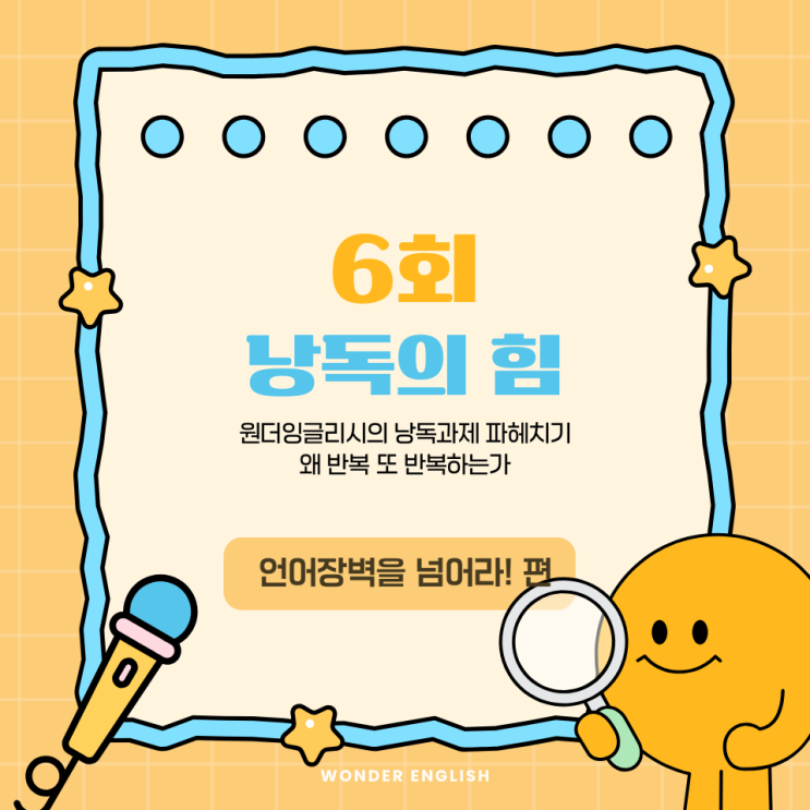 안녕하세요~ 원더잉글리시에서는 그래서 같은 책을 최소 6번 이상 낭독하고 녹음하는 과제를 통해 다독뿐 아니라 정독·유창성까지 함께 잡아오고 있습니다 ✔️원더잉글리시의 ‘6회 이상 낭독 과제’ 많은 부모님들이 궁금해하십니다. 하지만 영어 리딩에서 반복 읽기(Repeated Reading)는 아이의 읽기 실력을 가장 빠르게 끌어올리는 가장 확실한 방법입니다. 아래는 EBS에서 방영된 어린이 대상 영어낭독의 효과 테스트 영상입니다 실험에 참가하여 30일간 낭독반복을 실천한 아이들의 실력 정말 확연하게 차이가 나지 않나요? https://www.youtube.com/watch?v=jNmUZZEM-jo 그렇습니다 원더잉글리시는 아이들의 읽기 실력이 가장 빠르게....... <img src="https://blogthumb.pstatic.net/MjAyNTEyMDhfMTk4/MDAxNzY1MTk1MjgzNTYx.xryOLwsAUV1ACv8zN2x3LgK7VKkktOXH3snjOYkYX8Ug.jZ07j5Za9Rmc42g4TP8xSng-YsOeSNHTyFYrPYUH7UUg.PNG/6%C8%B8_%286%29.png?type=s3" />
