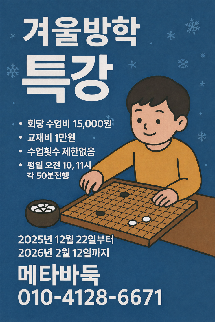 안녕하세요! 메타바둑교습소 고덕점 입니다. 방학은 아이들의 집중력과 사고력을 한 단계 끌어올릴 수 있는 가장 좋은 시기 입니다. 이번 겨울방학특강은 단순히 두는 바둑이 아니라, 생각하는 힘을 기르는 바둑 원리를 이해하고 응용하는 메타바둑 수업으로 진행됩니다. 방학특강 특징 1.바둑의 기초 원리부터 실전 감각까지 체계적으로 2.아이 수준에 맞춘 단계별 맞춤 수업 3.문제풀이 + 실전 대국으로 집중력, 판단력 강화 4.바둑을 통해 끈기와 사고력, 자신감까지 함께 성장 수강대상 초등학생 이상(입문, 초급, 중급 모두 가능) 이런 아이에게 추천합니다 1.방학 동안 의미 있는 성장을 원하시는 경우 2.바둑을 재미있게 배우면서 실력을....... <img src="https://blogthumb.pstatic.net/MjAyNTEyMThfNDkg/MDAxNzY2MDIzMDU3MDI0.1r8UTyPN6iMskR3pNhTut0UA2kzz_A34CN11TvRXQkEg.5izrigZgCbkE3Ynw_SzHzNnTmbGu30T00qj5JosLjWwg.PNG/%B9%D9%B5%CF%B9%E6%C7%D0%C6%AF%B0%AD.png?type=s3" />