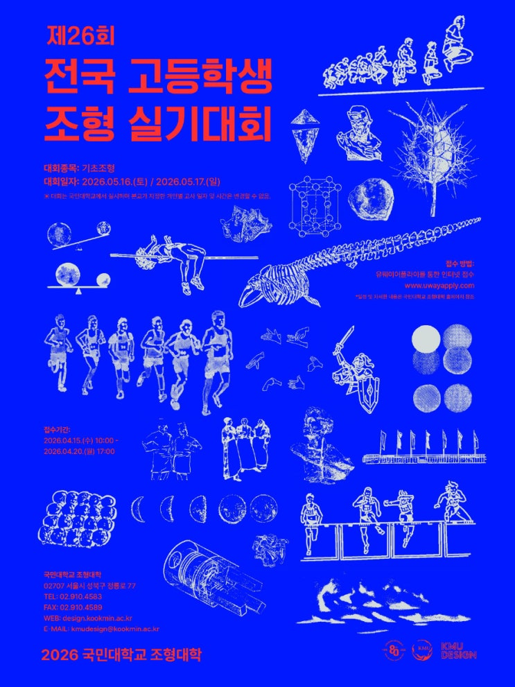 안녕하세요~ 강동창조의아침 미술학원입니다. 2026 국민대학교 실기대회 모집요강이 발표되었습니다. 기초조형으로 실기과목을 채택해 진행되는 국민대 실기대회는 국민대 수시에서 수상자특자자 전형으로 지원할 수 있는 자격이 주어지기 때문에 주목도가 높고 지원자가 많은 학교입니다! 자 그럼 강동창조의아침 미술학원에서 준비한 2026 국민대학교 실기대회 모집요강과 수상 특전, 접수방법과 접수처 등 세부내용을 살표보도록 하시죠~! 꼼꼼하게 잘 읽어주세요~! 2026 국민대 실기대회 접수는 4월 15일 수요일 10시 부터 시작됩니다! 선착순 접수라는 말이 나와있진 않지만 매년 빠르게 마감 되었던 전례가 있죠! 조기 마감이 될 수 있기 때....... <img src="https://blogthumb.pstatic.net/MjAyNjA0MDFfMjk0/MDAxNzc1MDI2MDU1MzM2.stncFEusMq5Hk35NY26t3WMcGwRFwrq4JJqMO15OfrIg.u8prr32wBMQ-9-Iref_vwreeuTzmaUGCAIO_saVLmpQg.JPEG/06.jpg?type=s3" />