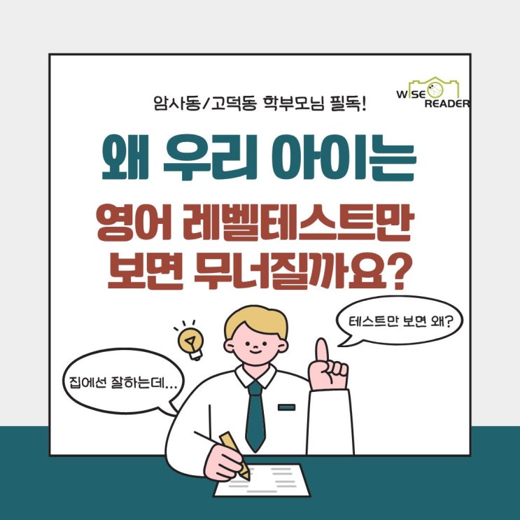 안녕하세요. 와이즈리더 영어도서관입니다. 겨울방학도 어느덧 반이 지나고, 다가오는 새 학기 준비로 마음이 분주한 시기입니다. 특히 암사동 영어학원을 알아보시거나, 고덕동 영어학원 상담을 여러 곳 다녀보신 어머님들일수록 이 고민이 더 크게 느껴진다고 말씀하십니다. 가장 큰 고민이 바로 '영어학원 레벨테스트'더군요. 여기저기 테스트를 보러 다니시는데, 결과표를 받고 나서 표정이 어두워지시는 분들이 참 많습니다. 오늘은 그 속상한 마음을 조금이나마 덜어드리고자, 현장에서 느낀 솔직한 이야기를 해보려 합니다. “집에서는 잘하는데, 왜 영어 레벨테스트만 보면 무너질까요?” 이유는 단순합니다. 대부분 영어를 못....... <img src="https://blogthumb.pstatic.net/MjAyNjAxMjZfMTQ1/MDAxNzY5MzU0NjQxMDU2.WbPsgMLHo6K7sEaCLNfR7tjx4K-z19FMxgOlYjKhH6gg.eoChnBHlw6noxgzz5SAtWD0rc5Ng8M8M4u93wotIKLAg.JPEG/1.jpg?type=s3" />
