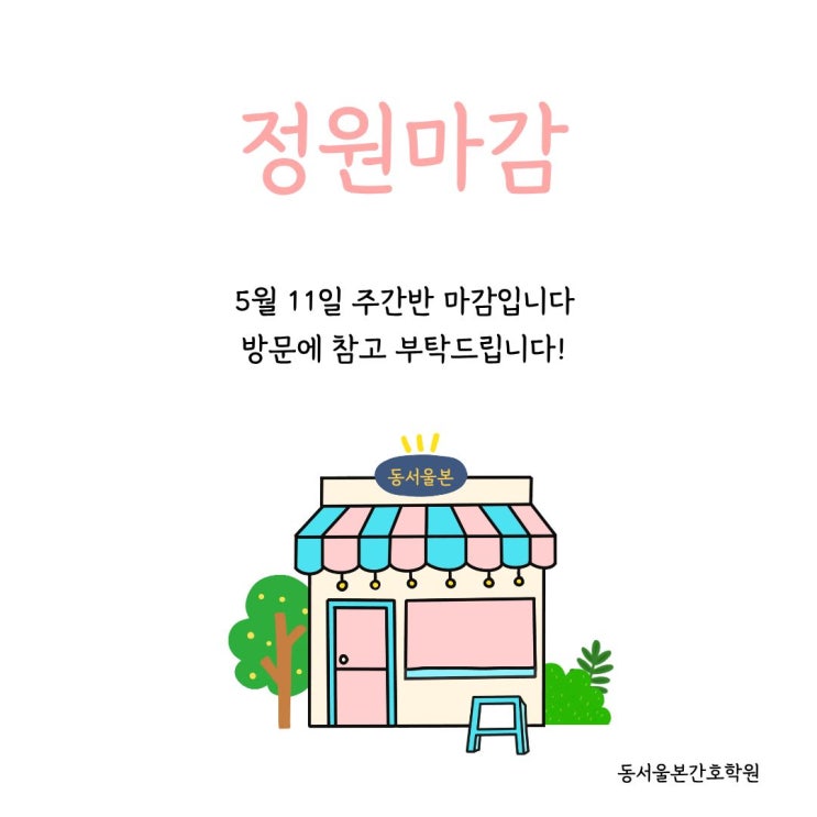 어제 외근 중 처음으로 개나리꽃을 보았습니다. 잠시나마 '드디어 봄이 왔구나' 미소 짓게 되더라고요. 또 한편으론 '벌써 3월 말이야?' 할 정도로 정신없이 지내온 요즘이었습니다. 아무튼 인생에 한 번 뿐일 26년의 봄을 허투루 보내진 말아야겠습니다. 학원은 최근까지 이번 3월 국가고시 준비와 3월반 및 5월반 모집을 위한 상담으로 정말 눈코뜰새 없이 바쁘게 보냈습니다. 그 결과 3월반에 이어 동서울본간호학원 5월 11일 주간반이 50명 정원을 다 채워 마감되었습니다! 이번에 5월반이 조기에 마감된 데에는 동서울본간호학원이 가진 강점도 있겠지만 주변 상황이 반영된 부분이 없지 않습니다. 간호조무사과정은 정....... <img src="https://blogthumb.pstatic.net/MjAyNjAzMzFfMTkx/MDAxNzc0OTI1OTYwNDc3.-smWPucefZpGCQu_-o07Tnhssxl9Y5-DQJxh78tldLgg.HA1GKzZlWYSvB-mRl94f9vM5SvkylkF6jUiEKZYoBC4g.JPEG/26.5.11%C1%A4%BF%F8%B8%B6%B0%A8.jpg?type=s3" />