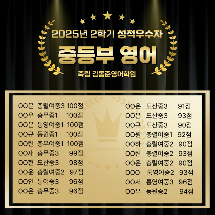 2025년 2학기 김동준영어학원 중등부 성적 우수자