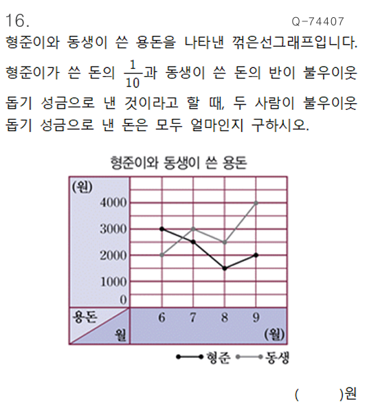안녕하세요 오늘은 초등 4학년 2학기 5단원 꺾은선 그래프 문제를 풀어보겠습니다 앞에서 배웠던 막대그래프 기억나죠? 막대 그래프와 꺾은선그래프의 차이점을 뭘까요? 막대 그래프는 자료를 크고 작음을 비교하기 좋은 자료이고 꺾은선 그래프는 시간의 흐름에 따른 자료의 변화를 관찰하기 좋은 자료입니다 자료가 어떤 주제냐에 따라서 쓰기 적절한 그래프가 있겠죠? 우선 형준이가 쓴 용돈을 볼게요 3000+2500+1500+2000=9000 형준이가 쓴 용돈의 1/10이니까 900원이 되겠네요 동생이 쓴 용돈을 볼게요 2000+3000+2500+4000=11500 동생이 쓴 용돈의 절반이니까 5750원입니다 그래서 답은 900+5750= 6650 답은 6650원입니다 그....... <img src="https://blogthumb.pstatic.net/MjAyNjAyMDNfMTAw/MDAxNzcwMDk0ODY2MjI0.o7q1QS9-jlgHlxpiP7l8SPd17jVGYL92cBwO-wyjyeEg.OGvIxlJriZ6A1xlM5VWFW-9vdj7CGY2laHbV-0MqjaIg.PNG/%C3%CA4-2_5%B4%DC%BF%F8_%B2%AA%C0%BA%BC%B1%B1%D7%B7%A1%C7%C1_01_.png?type=s3" />