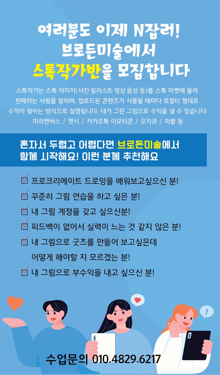여러분 안녕하세요^^ 브로든미술 원장 브쌤입니다 브로든미술에서 뉴 클래스를 오픈합니다! 바로바로 스톡작가반인데요! 스톡작가란 내가 만든 일러스트(그림)을 스톡마켓에 올려 판매하여 업로드된 콘텐츠를 팔아 수익을 내는 형태의 작가를 말합니다! 스톡작가가 되려면 어떻게 해야할까요? 일단 패드에 그림을 그릴 수 있어야 하겠죠?? 벌써 브로든에 다니는 친구들은 아이패드 프로크리에이트를 통해 일러스트를 그리고 있답니다. 그래서 우리 친구들이 스며들 듯 1주씩 해오던 디지털드로잉이 인기가 많아지면서 브쌤은 생각했지요!!! 우리 친구들이 앞으로 취미를 수익으로 연결시키는것!! 너무 좋은 일이겠다!!!!하고요!!^^ 그래서 디지털....... <img src="https://blogthumb.pstatic.net/MjAyNjA0MDFfNjQg/MDAxNzc1MDI0MzU4NTg0.MUhq1gAmDrmHpJpYkYznf_26HXHGa4p9bljoiE0Rx7cg.0lM1vA0VHLgPe6Trk16fq-IriYnEUFxwDRcgXAJ21sMg.JPEG/2.jpg?type=s3" />