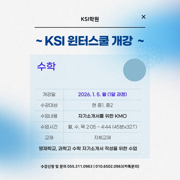 안녕하세요! KSI학원입니다. 곧 겨울방학을 앞두고 있는 학생들을 위해 윈터스쿨 개강 소식을 전해드립니다. 2026 윈터스쿨 [수학] 2026 윈터스쿨 [과학] 수업에 대한 문의 및 수강 신청은 KSI학원으로 부탁드립니다. [수업 문의 및 수강 신청] KSI학원 (서무과) 055-311-0963 (문자 또는 카톡) 010-6502-0963 KSI학원 카톡 채널 http://pf.kakao.com/_wIAmn - KSI학원 - <img src="https://blogthumb.pstatic.net/MjAyNTEyMTlfMjU2/MDAxNzY2MTI3NDI5MjIw.FRhkDhAbZvqR3fhbSuJHdDZBedm2HCIOECr5AyZ-zK4g.SW9y4Uxz1jQEgX056T39st-N56ab3n6AiFUTl0kia9Ag.PNG/8.png?type=s3" />