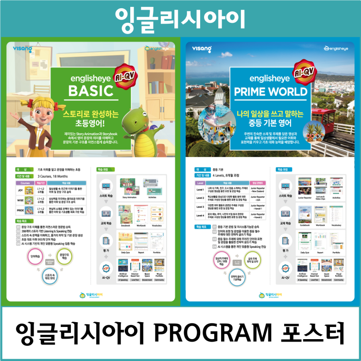 안녕하세요. 잉글리시아이입니다:) 잉글리시아이는 기존의 스마트 학습에서 한 걸음 더 나아가 AI, IBT, 게임, 영상 포트폴리오 등 다양한 학습 매체와 시스템으로 영어 말하기, 연습, 활용의 기회를 확대하고 학습자 주도의 학습 활동을 통해 학습 몰입도와 동기부여를 제공하는 차세대 학습 시스템 'AI-QV'를 도입하였습니다. 이에 맞춰 잉글리시아이 프로그램 포스터를 개편하였는데요. 그럼 함께 보실까요? AI-QV PHONICS 대상: 영어를 처음 시작하는 초등 저학년 기간 및 내용: 3 Levels, 6 Months 알파벳으로 시작 파닉스 리딩으로 완성! Song & Chant Animation, Lecture가 담긴 흥미로운 스마트 학습과 친절한 교재를 통해....... <img src="https://blogthumb.pstatic.net/MjAyNTEyMjNfMTI3/MDAxNzY2NDc2Mzc2MjAw.DGZqQuGfh-vQYzsdhtuv22l6tHjYfv7P-lxcdV2ksOUg.A17XSPxwnbSP8ILGsYutXT3ZkGV2BwtUL6qGQQ7Aq0kg.PNG/%B1%D7%B8%B21.png?type=s3" />