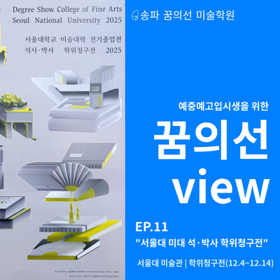 [꿈의선 view] 문화 예술, 영화, 책 그리고 학생과 그림, 예중입시 수업 이야기 등등 다양한 일상 이야기를 전합니다. 12월은 미대생들에게 “작업의 결산” 시즌이죠. 이번에 서울대학교 미술관 전시실에서 진행된 〈서울대학교 미술대학 석사·박사 학위 청구전 2025〉는 2025년 12월 4일(목)부터 12월 14일(일)까지 열렸습니다. 입시를 준비하는 학생, 진로를 고민하는 학부모님이라면 “지금 서울대에서 무엇을 연구하고, 어떤 방식으로 작품을 완성하는지”를 한자리에서 볼 수 있는 기회였어요. 1) 학위 청구전, 뭐가 특별해요? 일반 전시는 완성된 작품을 기획에 적절하게 보여주는 경우가 많다면, 학위 청구전은 왜 이 주제를 택했는지(문....... <img src="https://blogthumb.pstatic.net/MjAyNTEyMjNfMjQx/MDAxNzY2NDg2OTI2NTc4.gCmE0eP7GfTk79xSkbsstz4Nlb0yKfRen56aZU7nyjwg.ns8zIca5F9R82jPJoW9bLVAWny_KfFY9uO7q2zP80_sg.PNG/snu-art-museum-degree-show-2025-exterior.png?type=s3" />