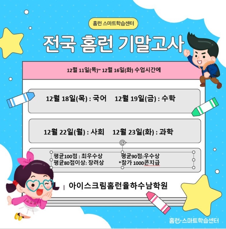 한 학기 동안 얼마나 이해 하고 풀었는지 점검 하는 날 입니다.!! 제가 다 떨리네요~^^ 12월은 시험만 치다가 방학을 맞이 하느라.. 힘들었을 홈런친구들.. 수고많았어!! #홈런스마트학습센터, #아이스크림홈런율하수남학원, #홈런학습센터, #전국기말고사율하수남학원 #기말고사, #홈런전국기말고사, #시험대비, #학습점검 +센터 <img src="https://blogthumb.pstatic.net/MjAyNTEyMjNfOTkg/MDAxNzY2NDczMzQ0ODU1.d1HiX0vgIIeNEaxCViwtW5-HVrIJKuQ1LQfDQKWHn5Ug.D-1dK2xuGxPEFUjel6AHRhleVUXX5oeftv6S9Jn8bvAg.JPEG/%28%C3%D6%C1%BE%292025%B3%E22%C7%D0%B1%E2%B1%E2%B8%BB%B0%ED%BB%E7.jpg?type=s3" />