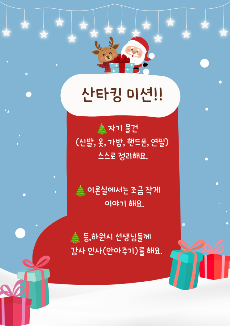 2025년의 마지막 악장, 올 한해에도 우리 아이들의 연주와 노래 속에 담겼던 열정과 아름다운 선율을 되돌아 보는 시간 12월이 되었네요. 처음 피아노 앞에 앉아 , 어색하게 움직였던 손가락 움직임이 아름다운 음악으로 들려질 수 있도록 응원 해 주시고, 격려 해 주신 부모님들께 감사드립니다. 12월에도 음악과 사랑이 가득한 공간 줄리어드음악학원에서는 산타킹, 암보데이 등을 통해 멋진 추억, 이야기를 만들어 가도록 하겠습니다. 1.산타킹 크리스마스와 연말 분위기와 그리고 우리의 성실성!! 3박자로 멋진 한해를 마무리 하려고 합니다. 우리의 미션은!! 1)자기 물건 스스로 정리하기 -정리습관 2)이론실에서 조금 작게 이야기 하기 -상....... <img src="https://blogthumb.pstatic.net/MjAyNTEyMTFfMjU3/MDAxNzY1NDIyNTg0NDUz.2VL5Wubv3veYTo9079SqW-SyYG8DnAmDUw_iOfZF1S0g.9srKbw3VDpC-epp4RwLOFCD1YtyU8YuIaZQSvsLK0lsg.PNG/KakaoTalk_20251203_210651431.png?type=s3" />