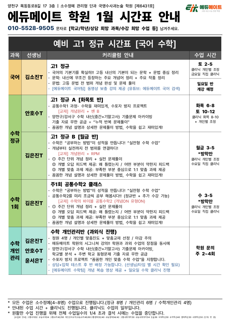 에듀메이트 학원 1월 시간표 + 한 눈에 보는 겨울방학 특강 시간표