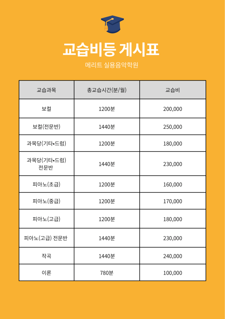 <제주시교육지원청 등록 제 2908호> *수강과목 보컬ㅣ드럼ㅣ피아노ㅣ기타ㅣ베이스ㅣ미디ㅣ작곡 저희 메리트 실용음악학원은 호원대학교, 동덕여대 대학원 출신 원장님과 전문 강사진으로 구성되어있습니다. 1:1 레슨으로 취미생들에게는 쉽고 재미있게 맞춤형 수업을 진행하며, 예술 고등학교, 예술 대학, 예술 대학 편입을 목표로 하는 입시생들에게는 체계적인 관리와 커리큘럼에 맞춰서 녹음 수업, 실기 모의고사, 입시 진로 상담을 진행하고 있습니다. 또한, 쾌적한 시설과 실력있는 강사님들이 모여있는 메리트 실용음악학원은 음악을 쉽고 재미있게 배우고 싶어하는 분들에게 음악교육 서비스를 제공하고 있습니다. 수강 관련 문의는....... <img src="https://blogthumb.pstatic.net/MjAyNTEyMDhfOTcg/MDAxNzY1MTg0NDYyMjUw.ziEQReZJSaex8yV2mEh9jstcY0RyMFY_Wj1nCJkh8CUg.y1_Gd66xJOPpEqKDVjCAW7D1KaYdKNCsEWnquG1gtwUg.PNG/%B1%B3%BD%C0%BA%F1%B0%D4%BD%C3%C7%A5.png?type=s3" />
