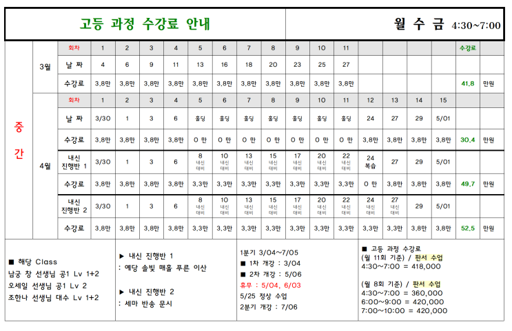 26년 3월~6월 수강료 안내