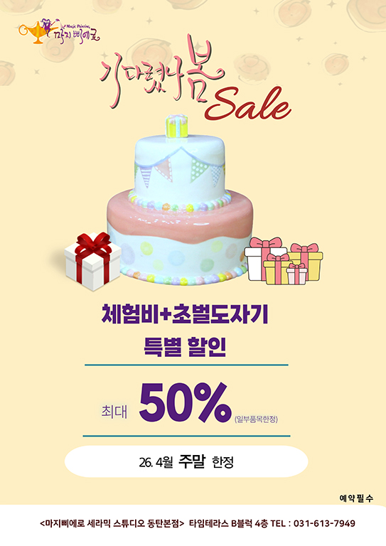 ★기다렸나 봄 이벤트 ★ 안녕하세요, 마지삐에로 도자기입니다. 새학기로 바쁜 시간을 보내다 보니 어느덧 따뜻한 봄, 4월이 찾아왔습니다. 봄꽃 소식과 함께 설레는 요즘, 봄맞이 인테리어와 새로운 식탁 분위기를 고민하시는 분들을 위해 특별한 이벤트를 준비했습니다. ✨ 나만의 감성을 담은 식탁 & 인테리어 만들기 지금 도전해보세요! ★ 이벤트 안내 ✔ 원데이 체험비 15,000원 → 7,500원 ✔ 도자기 재료비 별도 → 최대 50% 할인 (이벤트 상품 한정 / 재고 소진 시 종료) ✔ 진행 일정 → 4월 매주 주말 한정 ✔ 유의사항 → 미체험자(보호자) 입장 시 별도 비용 발생 ♣ 이런 분들께 추천드려요 집 분위기를 새롭게 바꾸고 싶은 분....... <img src="https://blogthumb.pstatic.net/MjAyNjAzMzBfMjYy/MDAxNzc0ODYwNjAyMjAz.g8eMrSw8-x1Nnsg0PWtRYJSMTYlWdinL150TCMmAWVUg.YTTt6oB3MncYc0XKZ2ee9rzundTEtpn7V_1rDR0rfY4g.JPEG/%EC%B0%BD%EB%A6%BD%EA%B8%B0%EB%85%90-%3F%8F%84%3F%9E%90%EA%B8%3F-%3F%95%A0%3F%9D%B8-%3F%82%AC%3F%9D%B4%EC%A6%3F_%EC%A4%84%EC%9E%84.jpg?type=s3" />