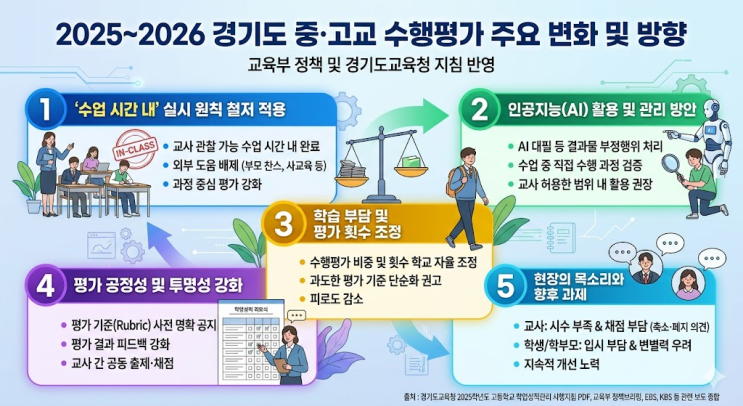 "엄마, 이번 수행평가 수업 시간에 다 끝내야 한대요..." 요즘 중고등학생 자녀를 둔 학부모님들 사이에서 가장 뜨거운 화두는 단연 '수행평가의 변화'입니다. 예전처럼 집에서 부모님이나 학원의 도움을 받아 정성껏 만들어가던 '숙제형 수행평가'의 시대가 저물고 있습니다. 경기도교육청의 2025~2026학년도 학업성적관리 시행지침에 따라, 이제 모든 수행평가는 '수업 시간 내' 실시가 원칙이 되었습니다. 우리 아이들이 학교에서 어떻게 평가받고, 무엇을 준비해야 하는지 핵심만 콕 집어 5장의 카드 뉴스로 정리해 보았습니다. 변화를 알면 내신 전략이 보입니다. * 전체 내용* 1. ‘수업 시간 내....... <img src="https://blogthumb.pstatic.net/MjAyNjA0MDJfMTIy/MDAxNzc1MTA1ODg5NzQ2.dCJChyOpcT6c0O6EU7D_L3kL6CfD-HnHXjffOTqS5dog.BMPg66mVOSLSI2yjDsbnTxS4YlY2gRYt_RYOEr7XsCYg.PNG/image.png?type=s3" />